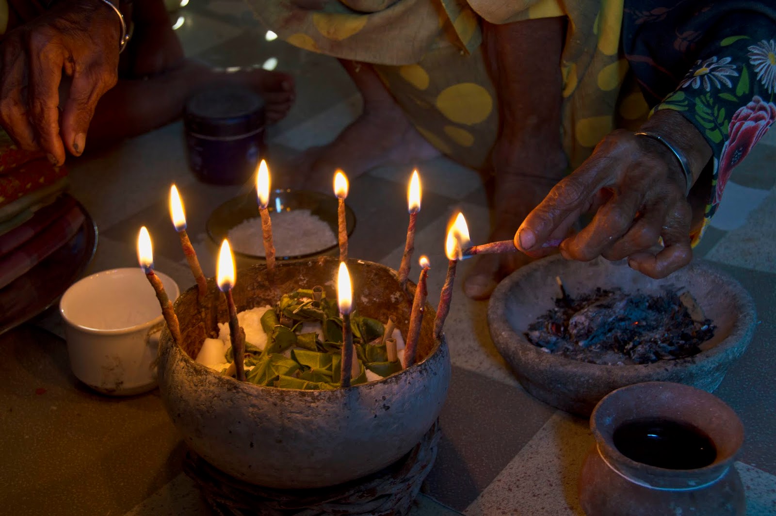 そこに、シリー(キンマ)を九つならべ、九本のロウソクを立てます。